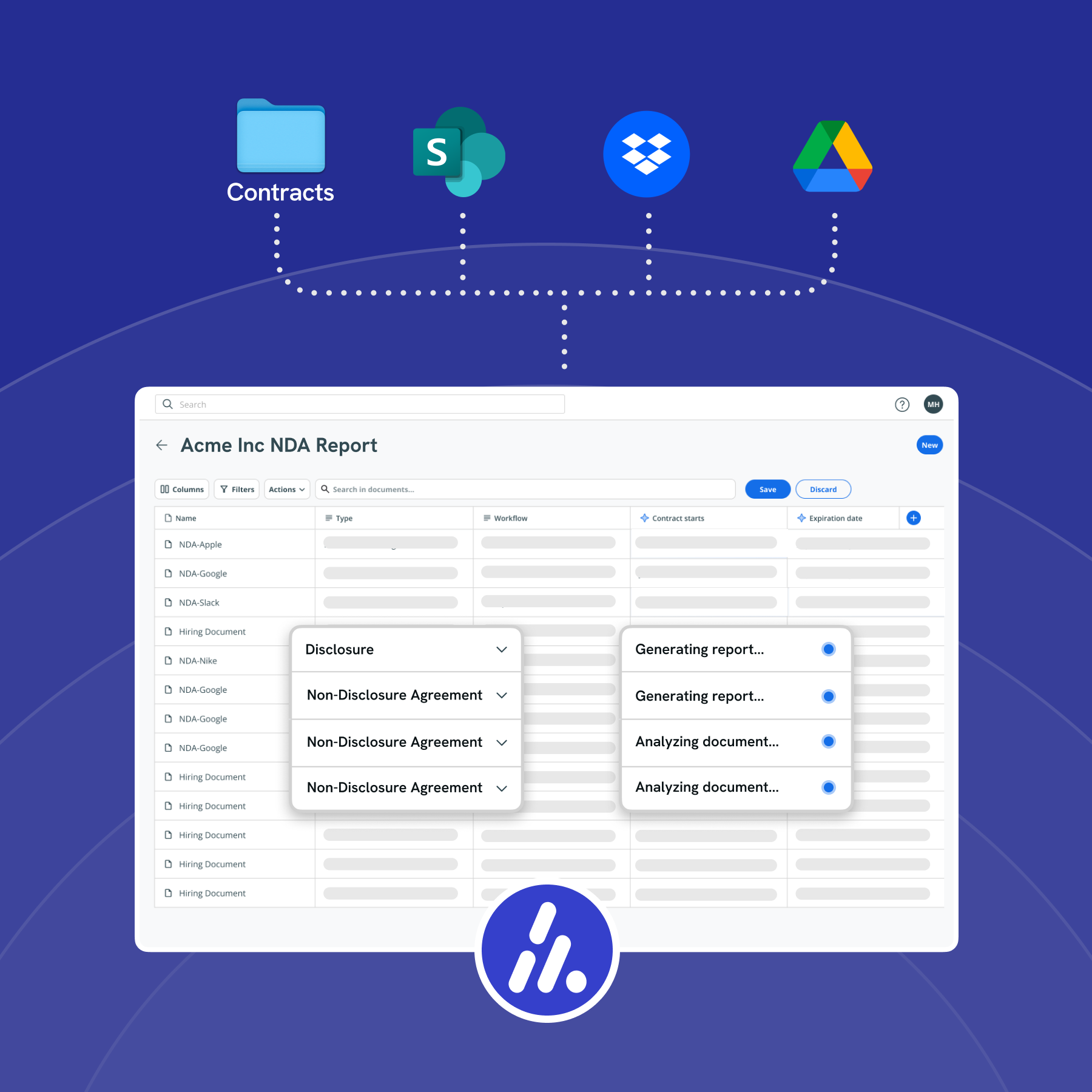 ✔️ Sync contracts from Google Drive, SharePoint, Box, and Dropbox. ✔️ Auto-ingest contracts and tag metadata without manual entry. ✔️ Keep every department aligned — with CRM and HR integrations.