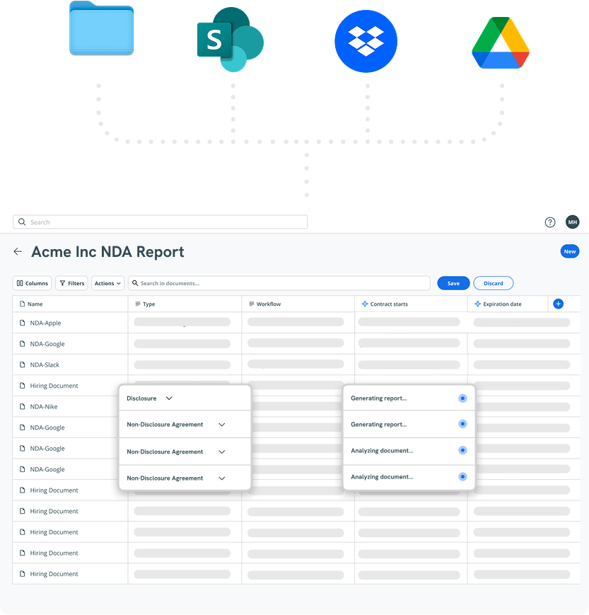 Most teams are live in an hour, with a custom tailored proof of concept. You can upload contracts from Google Drive, SharePoint, or your desktop and begin reporting immediately for free.
