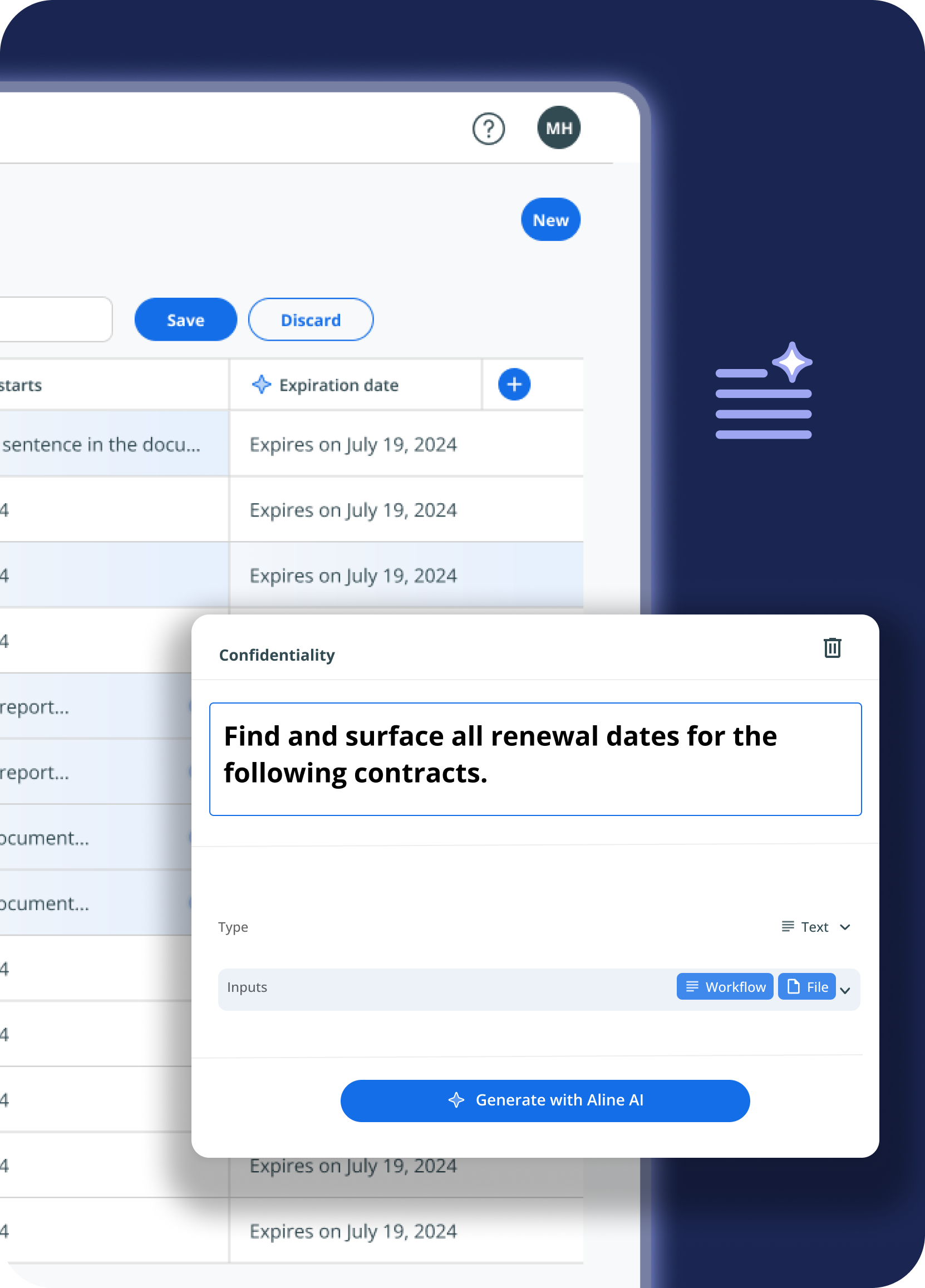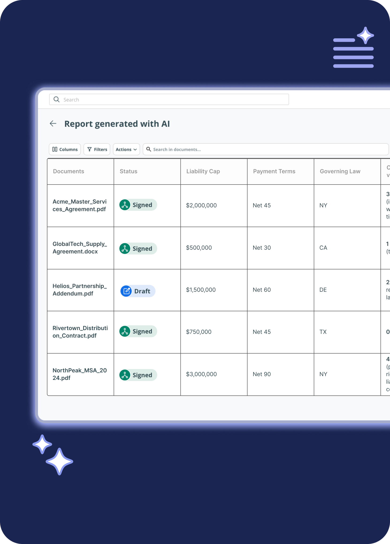 Yes. Legal teams use Aline to generate clause-level reports on liability, indemnities, and change-of-control terms for M&A diligence, IPO readiness, and board reporting — all in minutes.