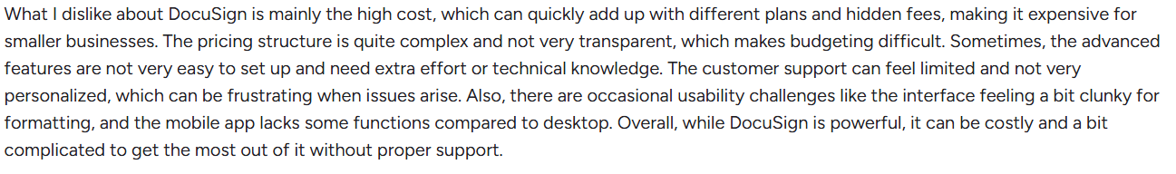 DocuSign’s pricing model is mainly per-user licensing, which can become expensive as more departments use the platform.