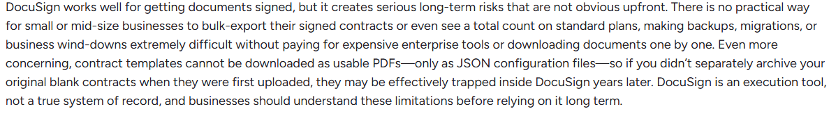 This becomes challenging when companies want to track obligations, renewal dates, or contract performance across many agreements. Without a centralized way to manage signed contracts, teams often end up relying on shared drives, spreadsheets, or manual tracking. One of the platform users notes that they primarily use the platform for a single step of the process: