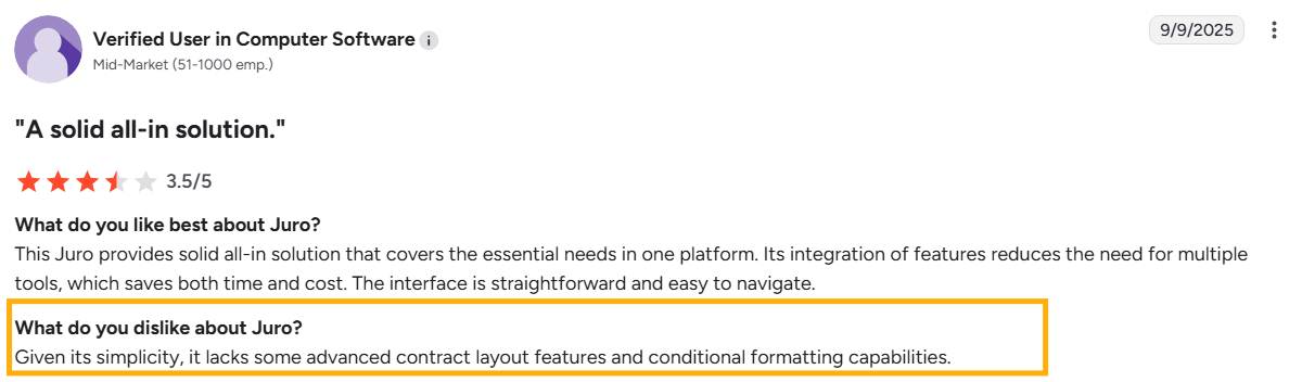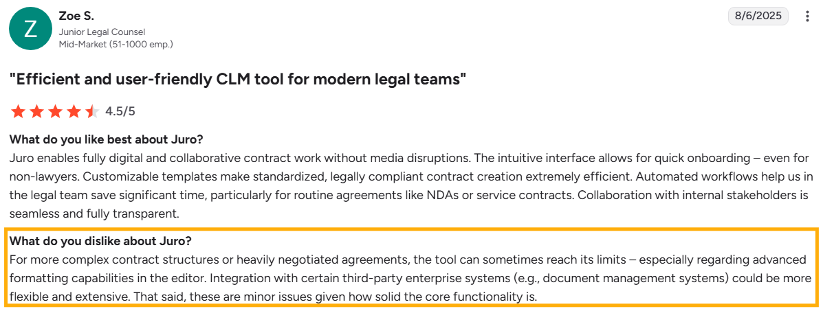 Juro works well when contract volume is manageable. It simplifies the contract workflows with a clean, easy-to-use interface. But that same simplicity is also where some teams start to feel limitations as requirements become more complex.